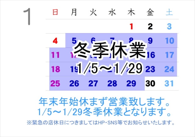 2025.12.06 新着情報 2025年1月の定休日のお知らせ 1/5~1/29は冬季休業となります。 年始1/4迄休まず営業致します。 緊急の店休日につきましてはHP・SNS等でお知らせいたします。