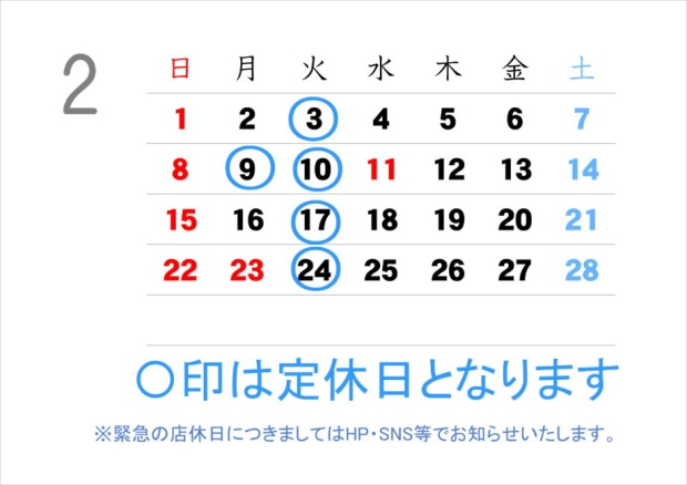 2026.01.29 新着情報 2月の定休日のお知らせ。 2月定休日 2/3・2/9・2/10・2/17・2/24が定休日となります。 緊急の店休日につきましてはHP・SNS等でお知らせいたします。 前の記事へ 一覧へ 次の記事へ