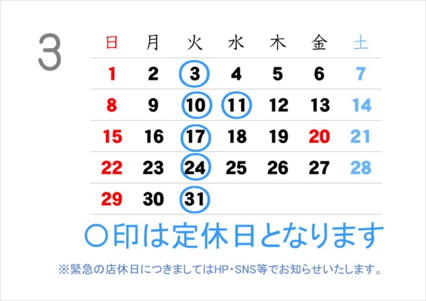 3月の定休日のお知らせ。