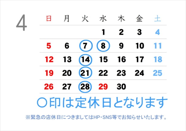 2026.03.29 新着情報 4月の定休日のお知らせ。 4月定休日 4/7・4/8・4/14・4/21・4/28が定休日となります。 緊急の店休日につきましてはHP・SNS等でお知らせいたします。 前の記事へ 一覧へ 次の記事へ